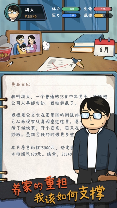 《中年失业模拟器》这款内容有趣玩法新鲜的趣味人生模拟类游戏,这款游戏的玩法相对的快速,在这里控制一名中年人进行冒险,你的任务就是在失业过后应该怎样重整旗鼓,完成各种有趣的对战,找出属于自己的工作吧!你还可以选择其他的工作来做,同时合理安排主角每天的开销,避免入不敷出。
