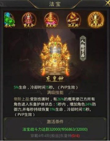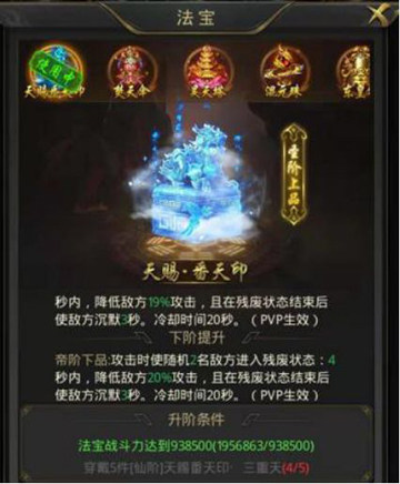 4、5阶法宝,单体攻击类法宝,每次攻击都有概率获得层数叠加,主要叠加的属性是攻击力及暴击伤害,叠满后非常爆炸。此法宝更适合攻速快的职业佩戴,推荐主迅捷。