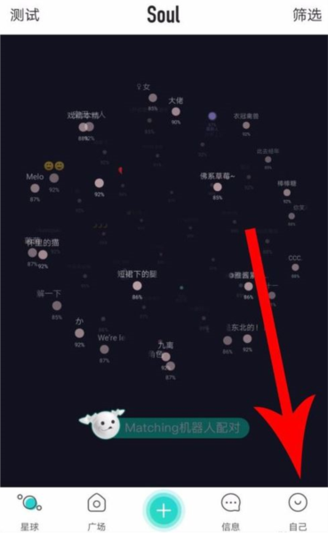 1、打开soul后,进入软件的首页,点击右下角“自己”按钮打开个人页面管理设置。