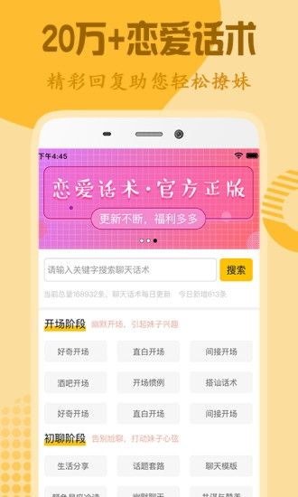 《恋爱话术2》是一款可以帮你解决以上烦恼的App。不会聊,只需搜一搜,N+精彩回复供你选择。让您和女生聊天不再烦恼,更有专业导师帮您解答问题。