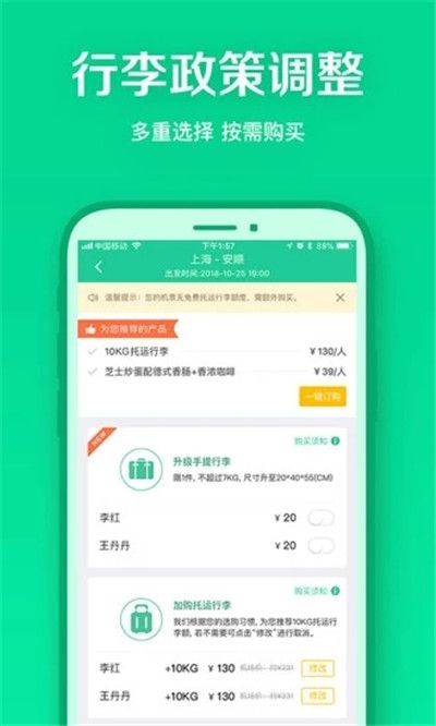 增值服务:买行李、订餐食、选座位、接送机一键购买。机票验真:新增机票验真,真假辨别易搞定。航班退改:优化航班退改,非官方购票也能退。