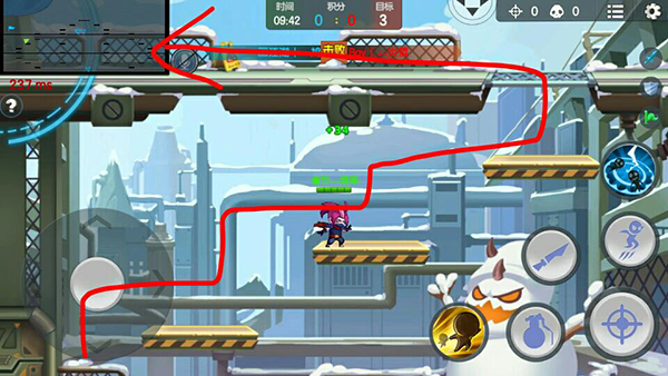 由于之前已经说了,左方想要赶到自己的防守地点所花的时间会比右方久,相当于当左方防守失利的时候,你们一复活赶到那个地点的时候说不定人家已经拿到旗子开始跑了,但是左方的地形却很特殊,也因此可以凭借左方地形控制住如图所示区域内的敌人,如图所示然后朝着敌人方向跳跃并眩晕住,可以尽力地拖住一点时间,配合着自己的队友,将敌人斩杀于眩晕中!这可是右方所不具备的!(使用李的效果更好)