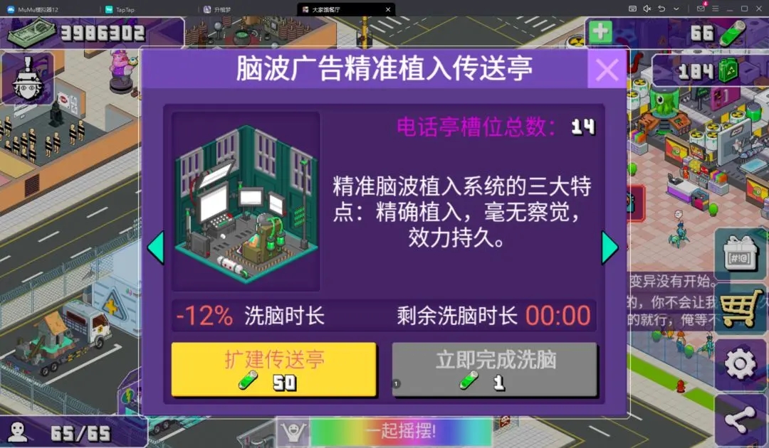 (1)优先把“饥饿素”用在电话亭,方便自主选食客,亦可看广告或参加大富翁快速拿钱来扩建~