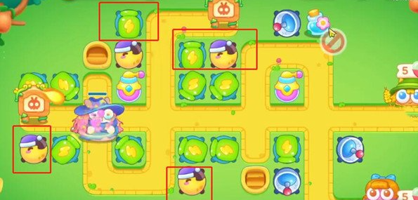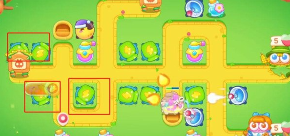 1、首先打开保卫萝卜4官方正版安卓版,我们进入关卡以后,在如图所示的红框位置放置1个分裂炮台,这样我们攻击怪的时候同时也可以攻击其他建筑物。