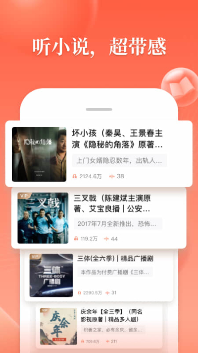 1、海量库存,聚合最丰富最优质的有声资源,只为满足您的阅读需求。