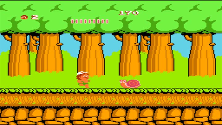 冒险岛是fc红白机平台最早的动作冒险题材的游戏一,游戏中一个憨头憨脑的小穿白色短裤的小胖子在一个小岛里狂奔,路上有很多水果可以捡取来增加生命值,这个生命值是随时间一直下降的,如果一段时间没有水果补充,主角就会死亡