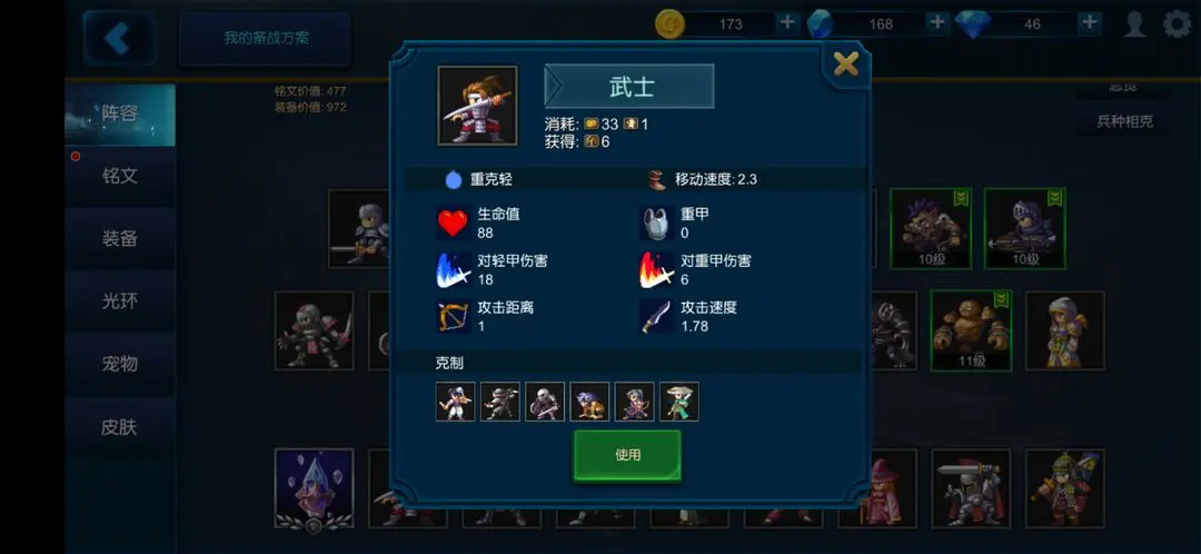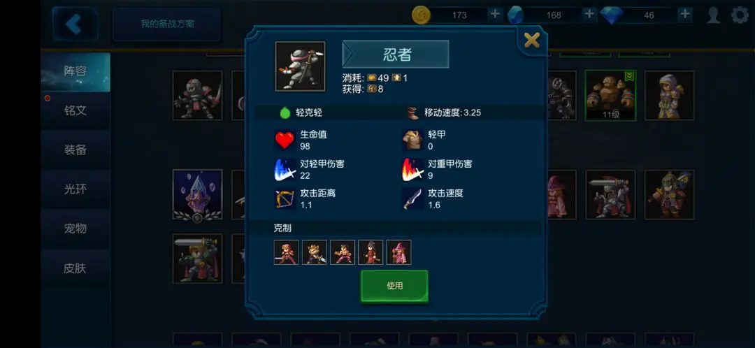 这位忍者穿的是布甲,忍者也擅长打布甲一刀22血,但是他打铁甲就9滴血。武士打穿布甲的忍者一刀掉了18血,但忍者打穿铁甲的武士一掉只掉9滴血。显然武士乱杀忍者,也就是武士克制忍者。这就是所谓的克制。