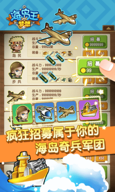 我们希望做一个不一样的海岛题材游戏。我们一直在思考怎么将放置类游戏的玩法融入到策略战争类游戏中,让玩家玩战争策略类游戏能够更轻松、畅快!梦想海岛王就是这样一个放置策略类的游戏。游戏一开始你只有一座荒芜的小岛,你需要依靠这座小岛,解锁海、陆、空三军强大的兵种,建立起自己的强大部队、驱逐黑恶势力、成就自己海岛王的梦想!
