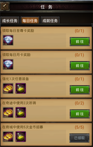 任务界面如下图所示,分别由成长任务、每日任务、成就任务三大部分组成。