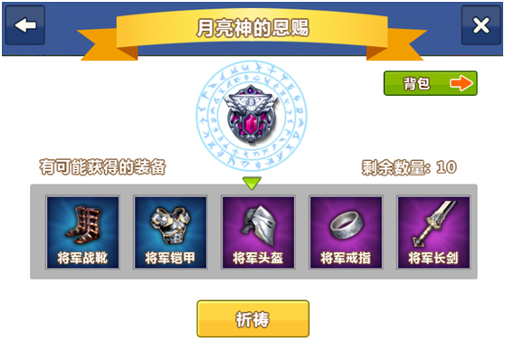月亮神的恩赐,几率获得蓝色、紫色装备。