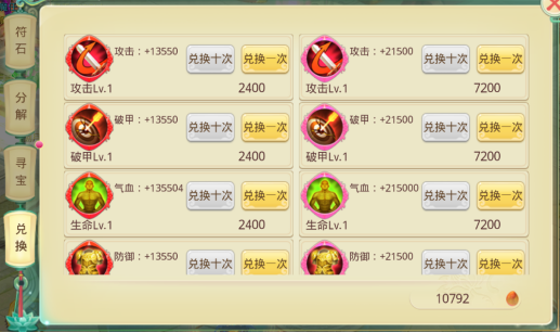 上面说了多余的符石可以用来分解,那么我们分解符石后得到的符石碎片就可在兑换界面进行兑换奖励了。奖励非常丰盛,包含了红的和粉色的所有符石。玩家可以把不需要或者重复的符石分解掉,然后在这边兑换想要的符石。