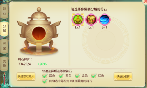 仙友们经过积累后获得更高的符石,这时候那些低级的铭石该怎么处理呢?这时候我们就需要点开这个分解功能了,如果低级符石的数量过多,我们可以选择一键分解,不用重复的点击选取操作。
