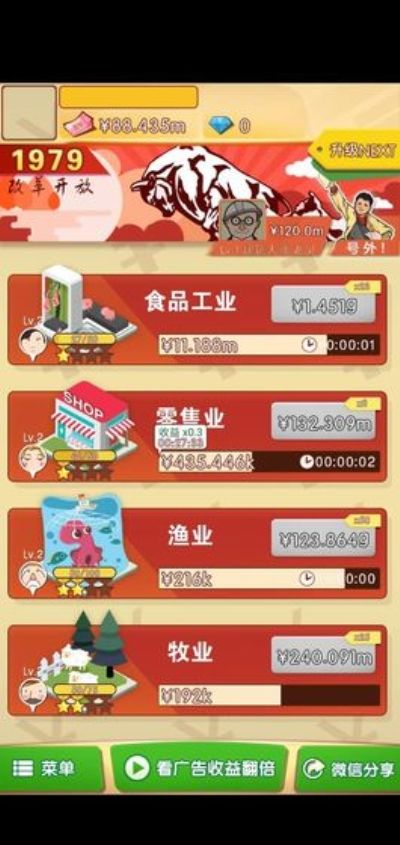 玩家回到1978年,进行商业投资。玩家需要投资产业获得金币来解锁产业和年代,到达一定金币解锁新一年代或产业,同时动画回顾年代代表性事件,给人一种年代冲击感。