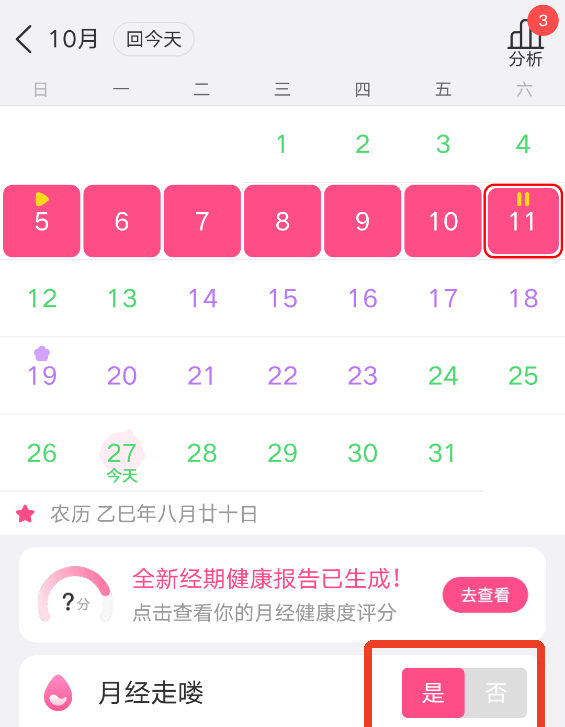 2)将【大姨妈来了】选择为“是”,就会自动更新新的经期开始日,并进行智能计算。