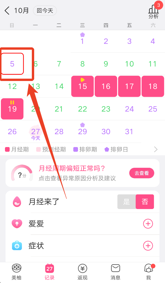 1)点击日历上正确的姨妈开始时间,如图上的5号。