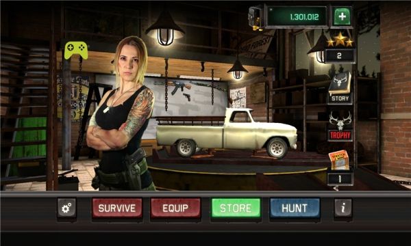 3、游戏操作说明:进入游戏主菜单界面,点击下方靠左边的“SURVIVE”-->弹出“CHOOSE HUNTING AREA”的界面,点击左边白色的“JULIETT”-->弹出“SURVIVAL BRIEFING”的界面,点击右下方“HUNT”-->弹出“REMEMBER”的界面,点击右下方“OK I GOT IT”即可开始游戏。