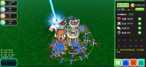 2、魔塔:伤害能秒杀,射速也够,射程也行,血量因为旁边有爆塔,也不怎么掉血(先死都是死的藏塔,然后才是魔塔),这塔主要是前期靠中期才起得来,伤害点到秒杀当前怪物就行,然后就一直加射速就ok,很强,后期刷怪贼快。