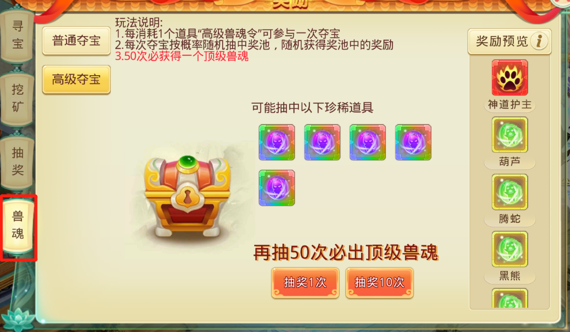 方法二、夺宝:是以上道具最快的获取途径,需要消耗兽魂令夺宝。推荐不想肝副本的大佬可用这种方式获取。