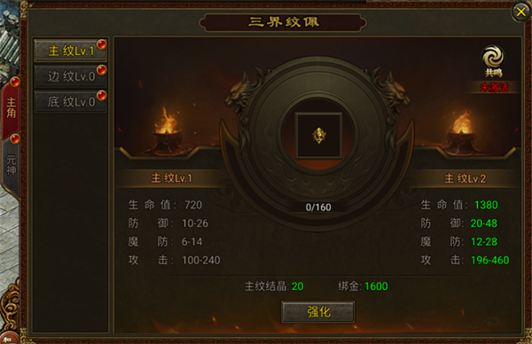三界纹佩共有三处需要进行升级的地方,分别为主纹、边纹以及底纹。纹佩系统的升级需要用到对应的结晶以及一定数量的绑金。每点击一次强化,纹佩进度条将会提升,当前阶段的进度条攒满后,即可进入下一等级并获得大幅的属性提升。