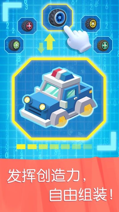 【组装汽车,开车环游城市】自由搭配轮胎、贴纸等汽车配件,发挥创造力,组装警车、压路机、装载车等24款车型吧,然后开着新汽车环游城市!多种富有挑战性的上下坡地形出现,一路飞车,注意安全!(儿童创意DIY,体验驾驶的乐趣)