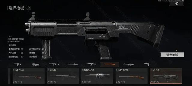 第三把是新型的泵动式霰弹枪DP12.它采用无托设计、结构紧凑,弹药由两根独立枪管供弹,可以支持短时间内双发射击,可以视为SPR310的升级版。不过由于没有弹匣供弹,只能手动单发装填,因此交战时最好不要将子弹倾泻一空,最好预留几发应对突发情况。