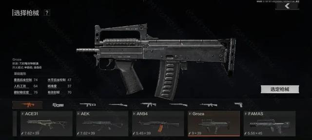 白狼提供的武器则为GROZA突击步枪,使用9×39毫米口径弹药、枪械采用无托设计,以成熟的AKS-74U突击步枪为参考,定位和VSS比较类似,射速虽不及VSS,但也比其他大多数突击步枪更快,同时也比VSS更容易控制后坐。