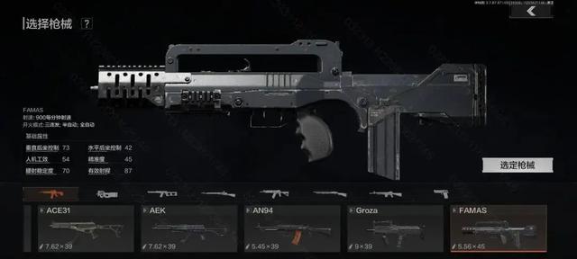 黑金国际提供的武器为FAMAS突击步枪,使用5.56x45毫米口径弹药,整体采用紧凑无托结构,弹匣设计于贴腮位置,采用闭锁待机设计,支持三连发、半自动、全自动三种射击模式,整体并不需要过多改装,加装枪口和握把之后,后坐控制属性就非常优秀,易于操控。
