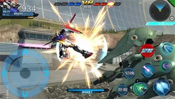 游戏主打硬派动作风格,使用3D物理碰撞、受力反馈、重力补偿、动态镜头等次世代技术,完美模拟驾驶敢达作战的操控体验。达到主机级手感的移动、侧滑、喷射、飞行、射击、格斗、格挡、控制加上浮空连击等多元化战斗效果,颠覆你以往的动作手游体验。