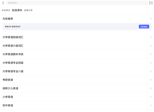4.使用此功能时,需要选择课本。我们点击“选择课本”按钮,然后在本地课本/在线课本/创建分享界面选择需要学习的课本导入即可;