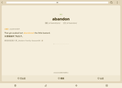 6.被单词界面可以选择不认识、模糊和认识,而底部的按钮分别是删除、笔记、朗读和释义;