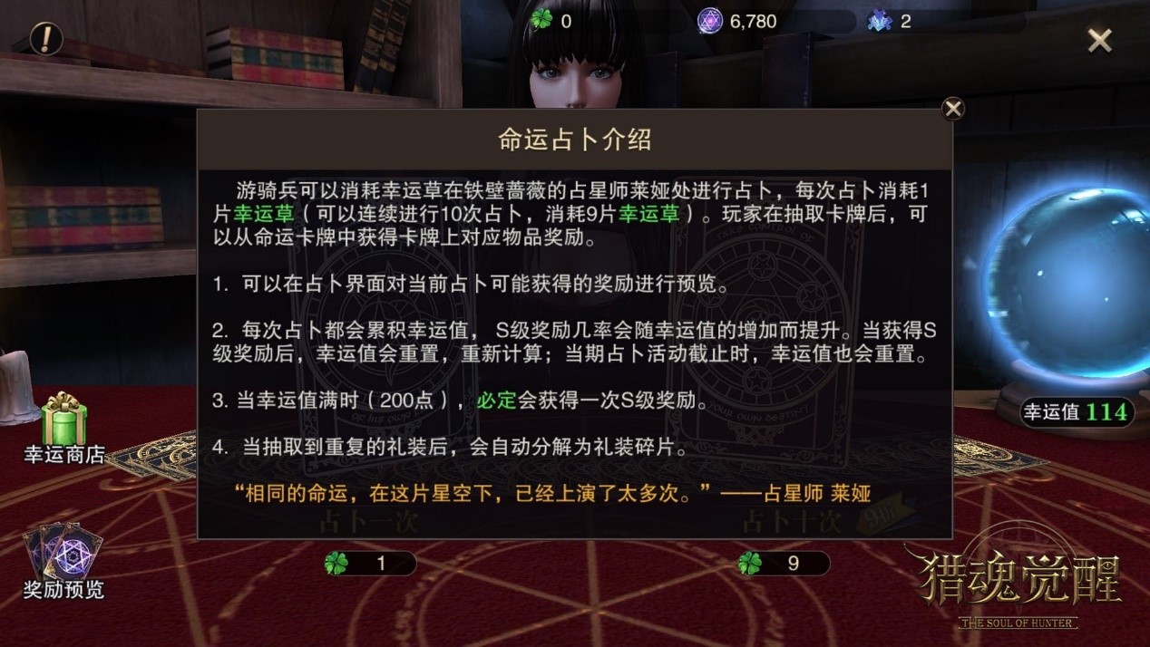 而且在每次占卜后,您还可以获得60点幸运积分,使用幸运积分可在莱娅的幸运商店中兑换命运之门入场券,获得进入命运之门的资格。而在后续的更新中也将有更多的珍贵道具进入幸运商店中。莱娅就在铁壁蔷薇酒馆等待着大家,快来看看命运将你引向何处吧~
