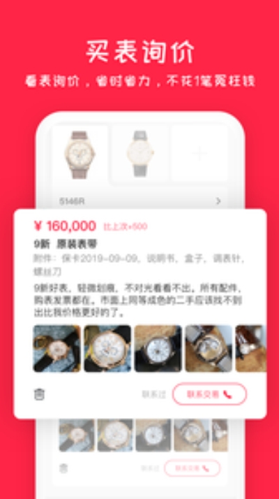 看表询价,省时省力,不花1笔冤枉钱。聚集全国二手表商家,并对商家身份及资质进行认证审核。商家通过商家版专用App进行货源管理,用户对感兴趣的表款可以主动发起二手表的询价求购,与商家进行询价,接受报价后获取商家信息,直接与商家对接,自行选择是否线下交易。