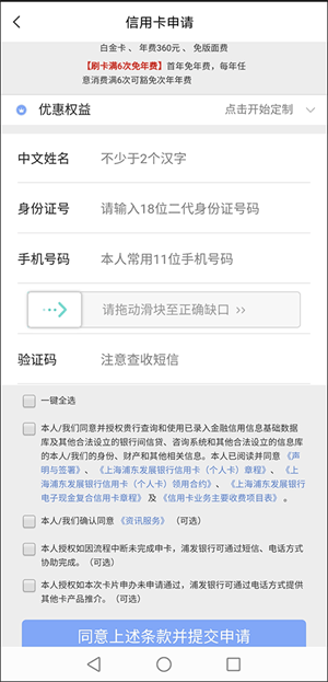 3、在具体信用卡申请界面中,用户需要填写好中文姓名、身份证号、手机号码、滑动验证码、输入短信验证码;