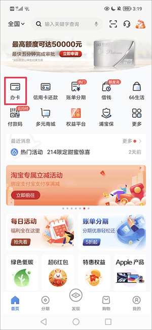 浦大喜奔app如何办卡?