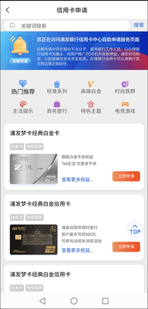 2、在信用卡申请界面找到并点击你想要办理的卡类型,点击立即申请按钮;