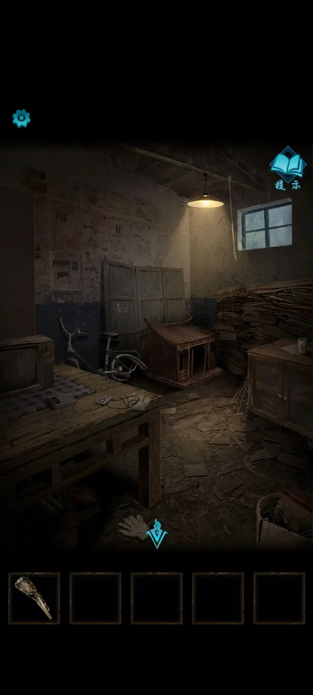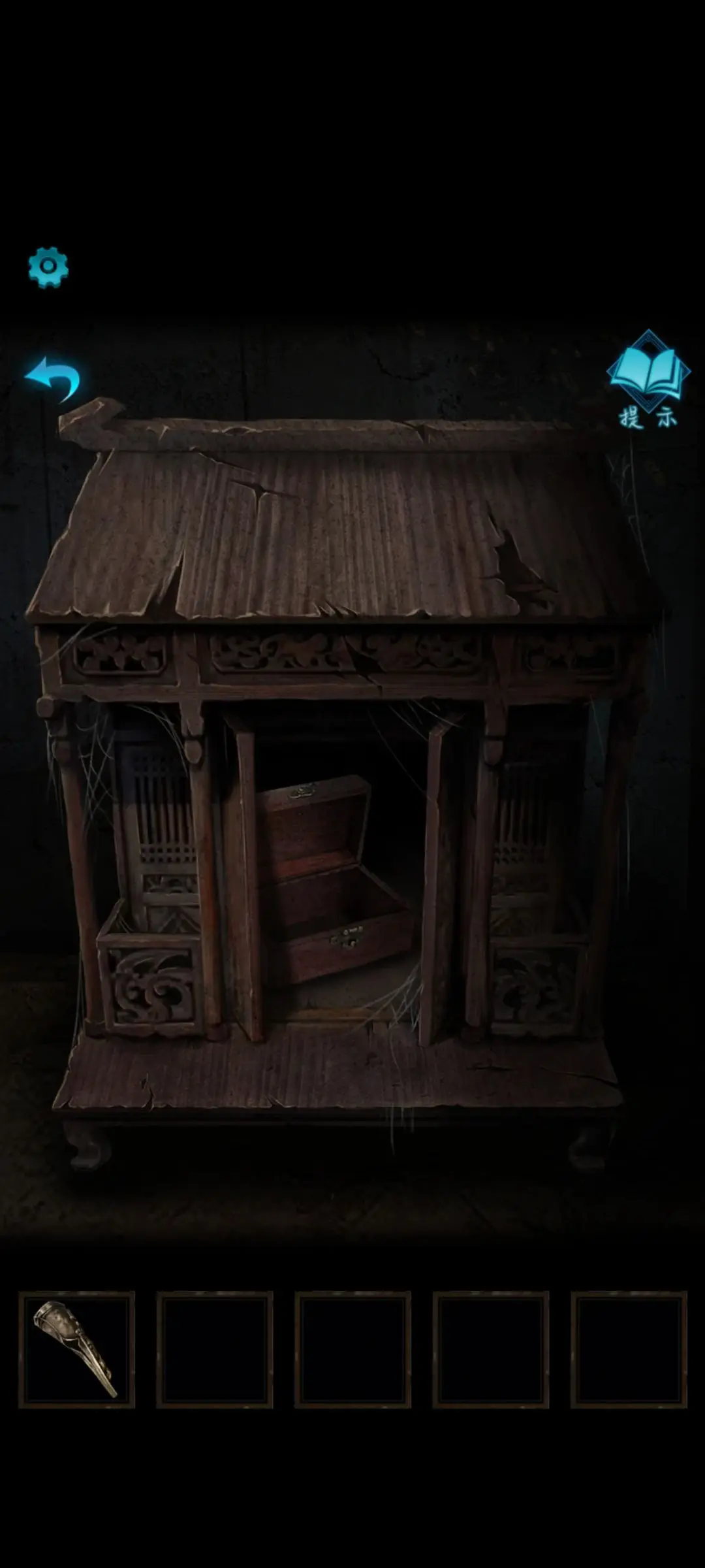 用火钳打开右上角这个房间的灯,点击中间的草屋完成盒子的拼图,得到铜指甲