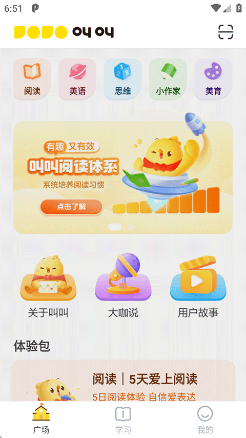 叫叫支持3~12岁孩子的在线教育能够帮助每个用户全方面提升自己的成绩,该软件主要通过阅读、互动课堂等多个方面来进行操控让每个人找到适合自己的学习方法并且还能通过软件中的脑力大比拼等趣味知识小游戏来提升用户学习的兴趣