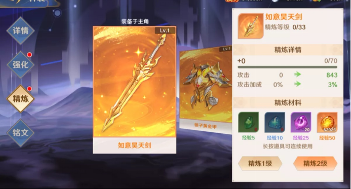 2、装备精炼:通过消耗精炼石可以进行装备精炼,精炼也可以增强装备属性。装备共鸣是逢10倍数增长一个等级,增加额外的基础属性。