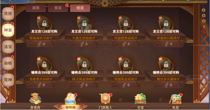 攒够玄铁、装备精华可以到【商店-神装】页面兑换更高级的装备。(红色装备不可兑换)