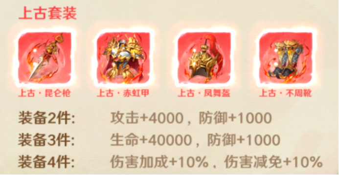 3、神装效果:除了洪荒、上古、九州这三类神装有四件套的额外加成,其余的基本都是数值面板的加成。