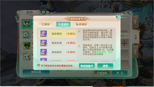 (2)宠物可以通过使用技能书学习新技能,学习过程中会随机顶替已学习的技能。