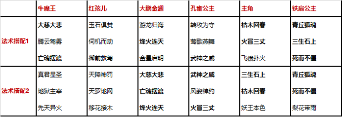 法术搭配2:这套法术搭配更注重均衡,没有把全部的宝都押在前期。前期的主要战力在大鹏身上,后面由牛魔王来接管战局,整体阵容的搭配更注重成长性。第1套法术重点是要打架,粗暴的打架,力求快速解决战局,这套则是尽力避免对抗,应用控制类法术,减少受到伤害的次数,力求活下来。