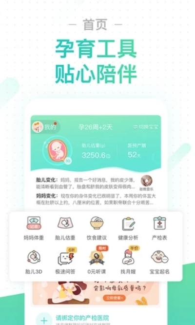 为准妈妈倾心打造的妈妈体重监测、胎儿估重、胎动计数器、产检提醒、看懂B超单等管理孕期健康工具;为产后妈妈提供疫苗提醒、宝宝成长记录、能力发育测评、早教课堂等宝宝健康管理工具。