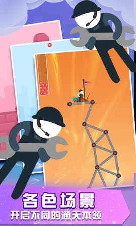 火柴人通天塔是一款十分有趣的休闲益智类游戏。在这款游戏中玩家将操控火柴人们搭建出一座高塔以抵达目的地,塔越建越高,但是稳定性也随之越来越差。游戏前期只用搭建较矮的塔,但随着你的熟练度越来越高,你需要的塔也就越来越高,所以一定要先练好手,再来进行进一步的通关。
