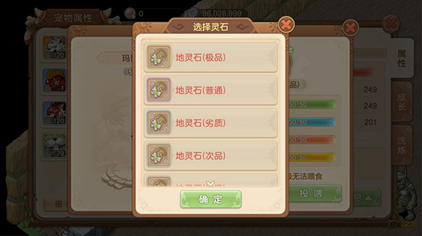 养成指南:基础喂养数值介于23-27点之间,满值为50点。根据灵石质量进行喂养值的增减。每次角色升级5级喂食调节取消。不论是满值的石MM还是任何单一项数值,均可进行培育无限制