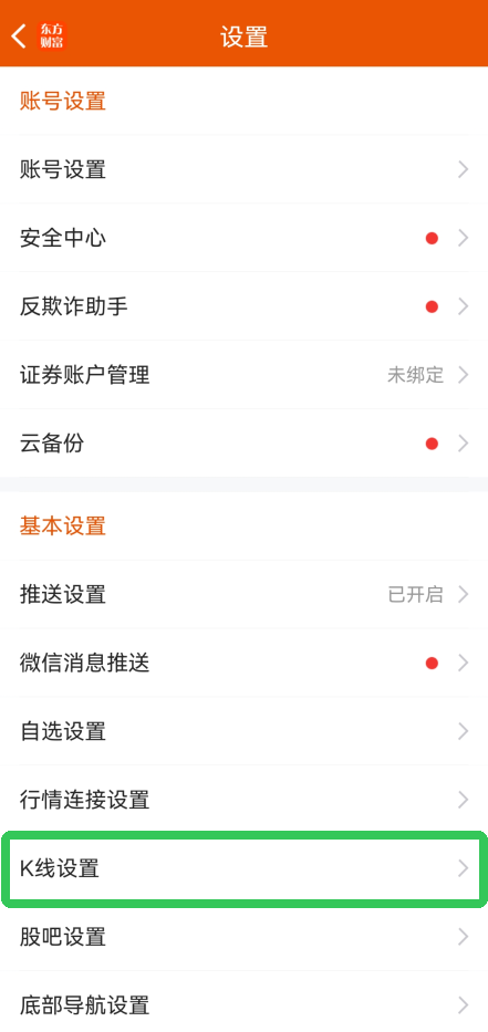 2、下滑找到【设置】点击进入,找到【K线设置】,或者换点击个股K线页面的设置功能也能进入。
