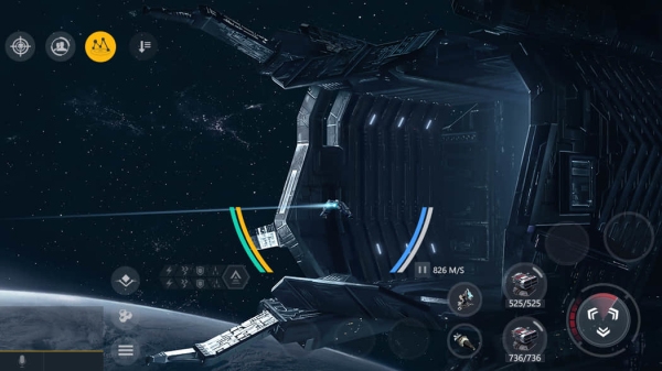 若您更习惯于二维移动,则可以点击屏幕右侧的战术视图进入类似RTS游戏的视角,在这个视角下以您的舰船为中心会出现一个圆盘,您可以将它理解为“地面”:在其上任意角落进行“双击”,舰船就会朝您点击的方向飞行。