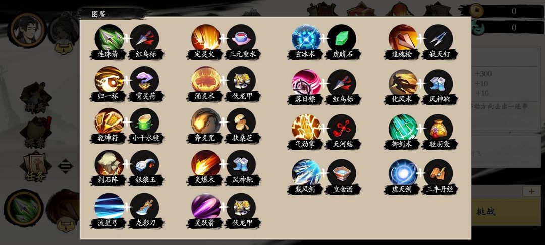 图内技能俗称法宝+装备构成,主法宝7以后+任意1法宝合成超武。图没有效果介绍。初始无脑选涌炎术,关卡现在做到合体后期了,刷一把1万+铜币+炼丹药材!所以尽量推到你能推到的最高图,再回来刷实力能过的,过不了图没有奖励。
