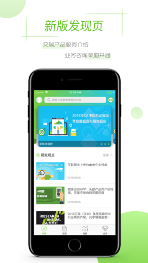 整合了艾瑞独家指数排名、实时互联网资讯以及艾瑞商业分析报告等服务,为用户提供专业的商业大数据产品