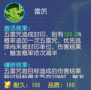 使用五雷咒时,有概率对首目标附加失心符,如果失心符命中会再次追加五雷咒。运气好可以将敌方五人全部连击一次、顺带施加封印效果,可玩性极高。